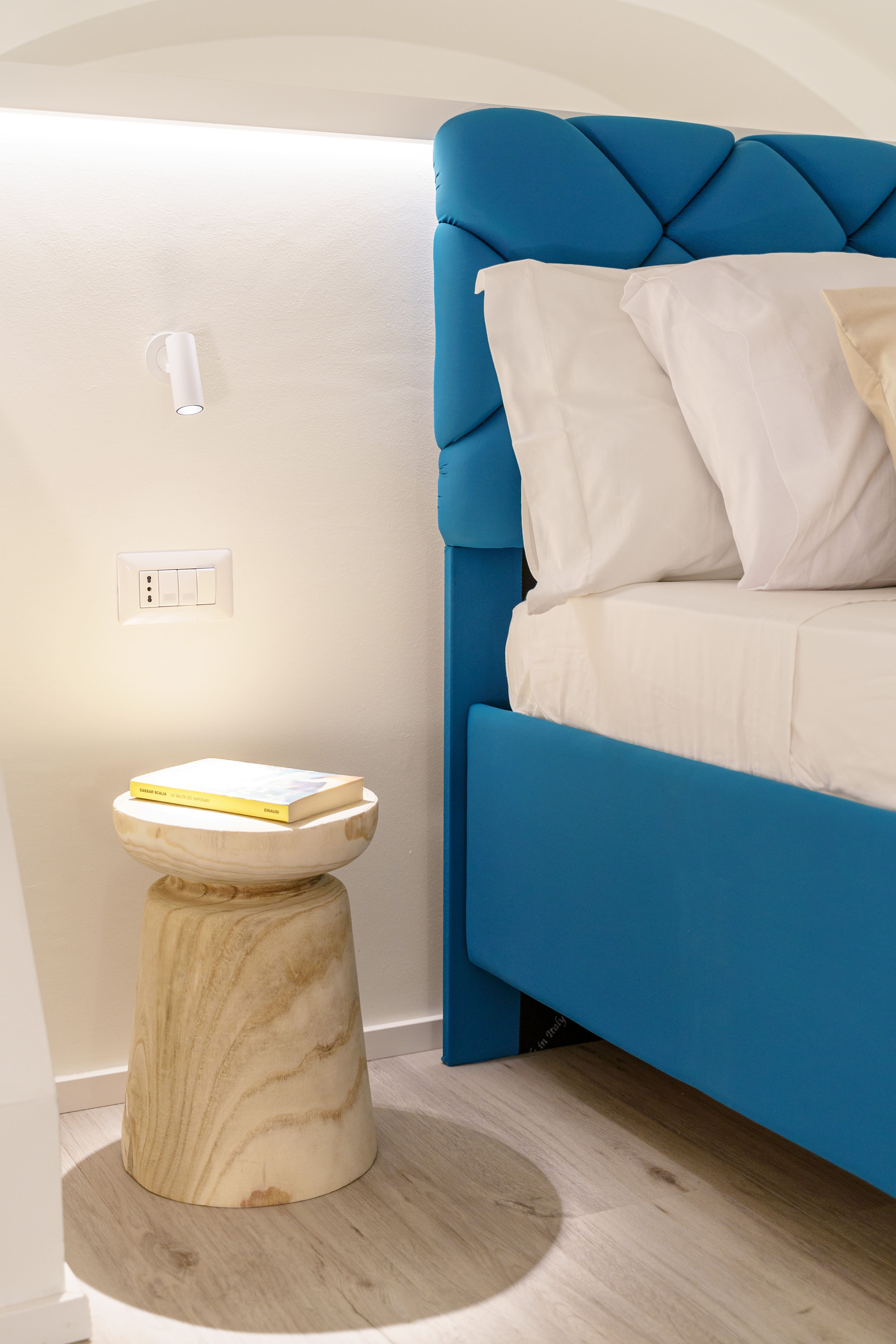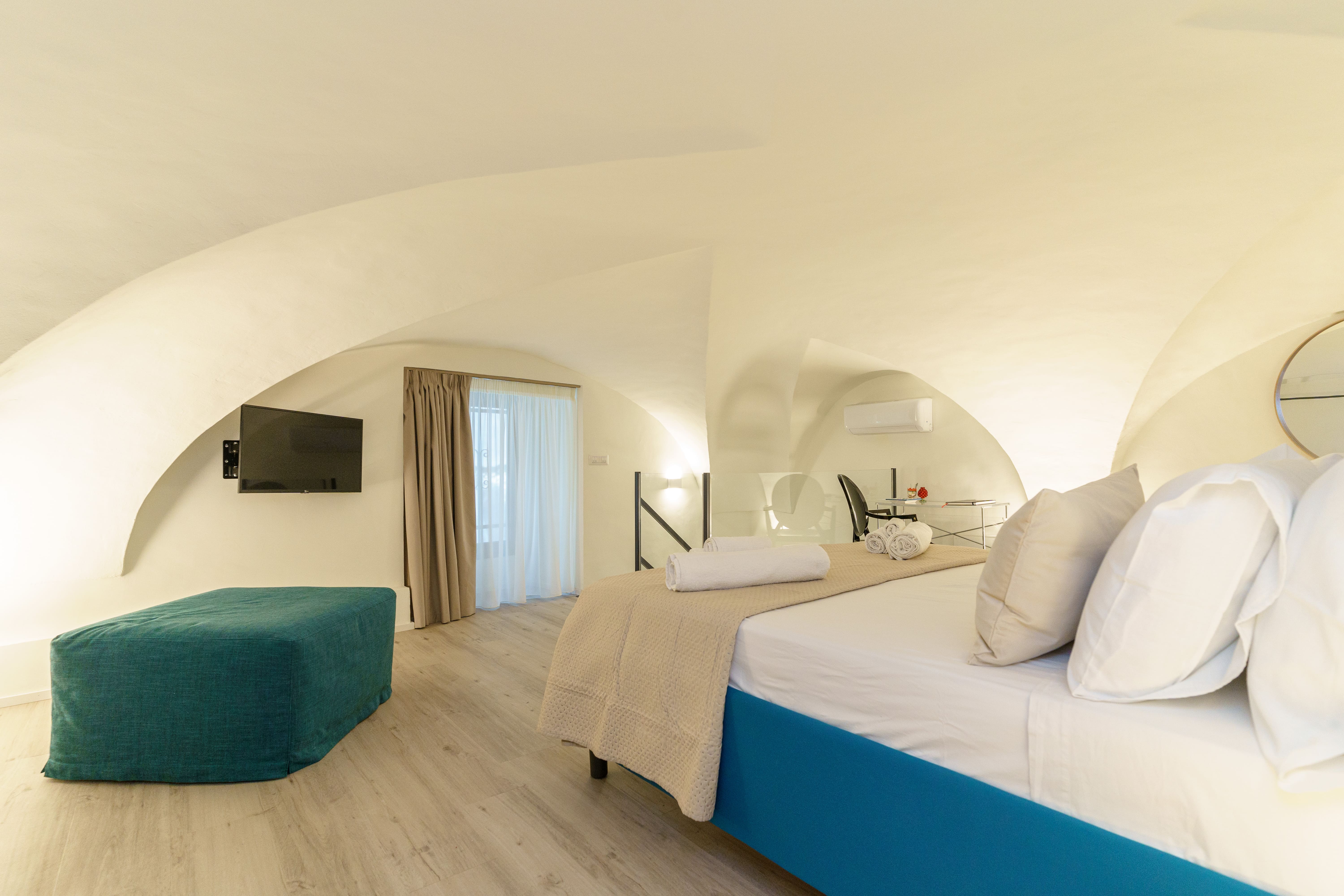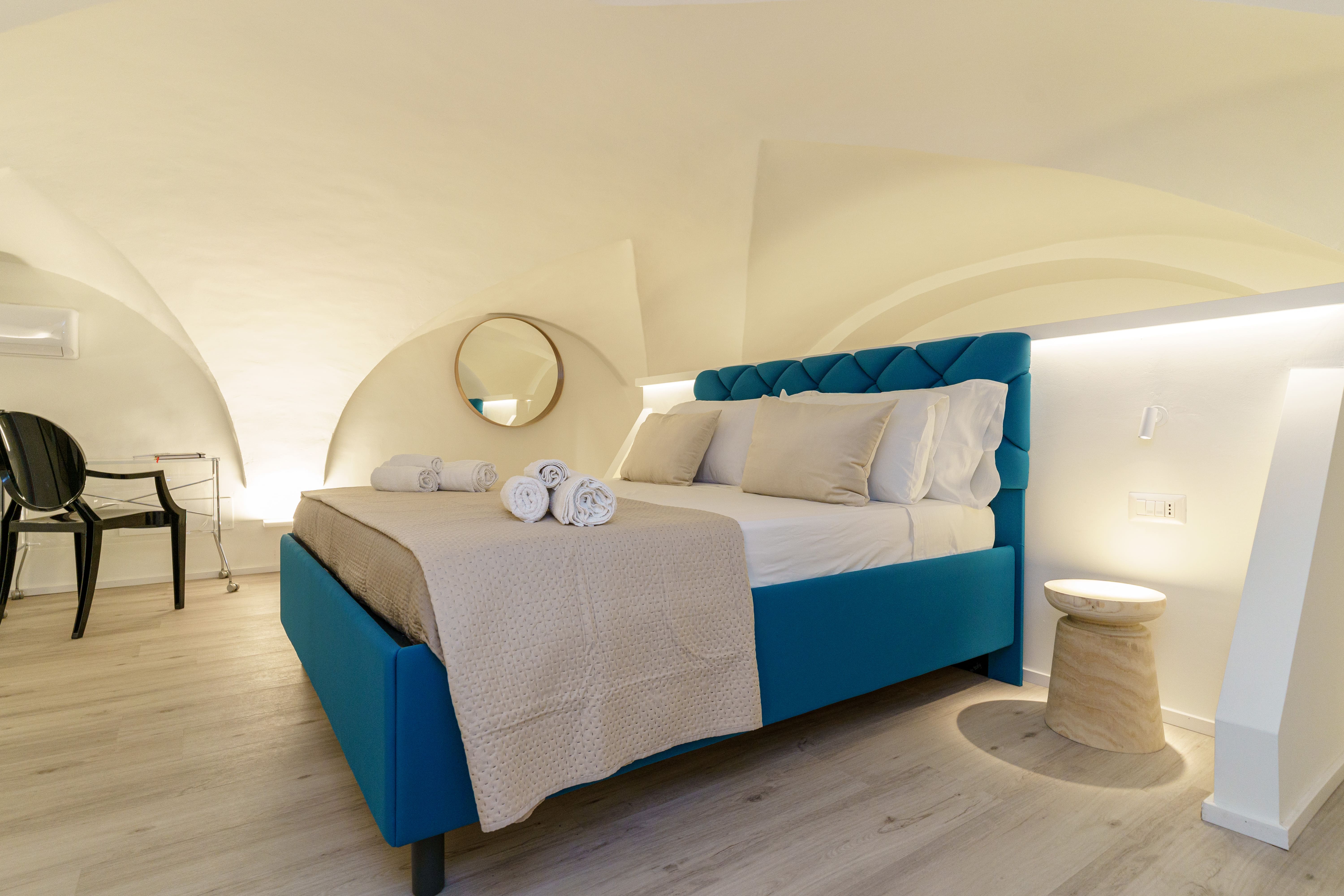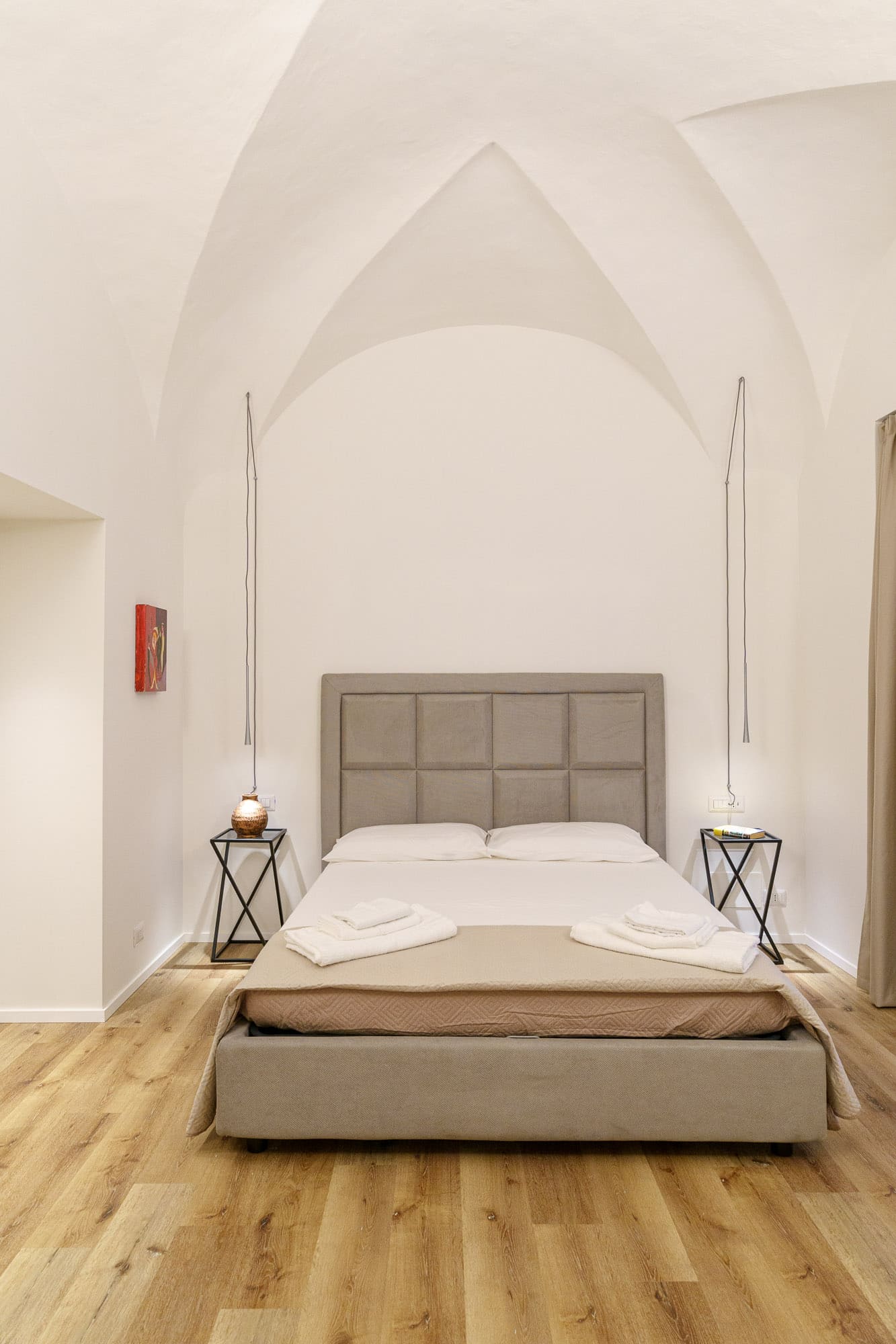 La camera da letto, soppalcata e caratterizzata da originali e suggestivi soffitti a volta, offre un ambiente intimo e accogliente, perfetto per il riposo.
